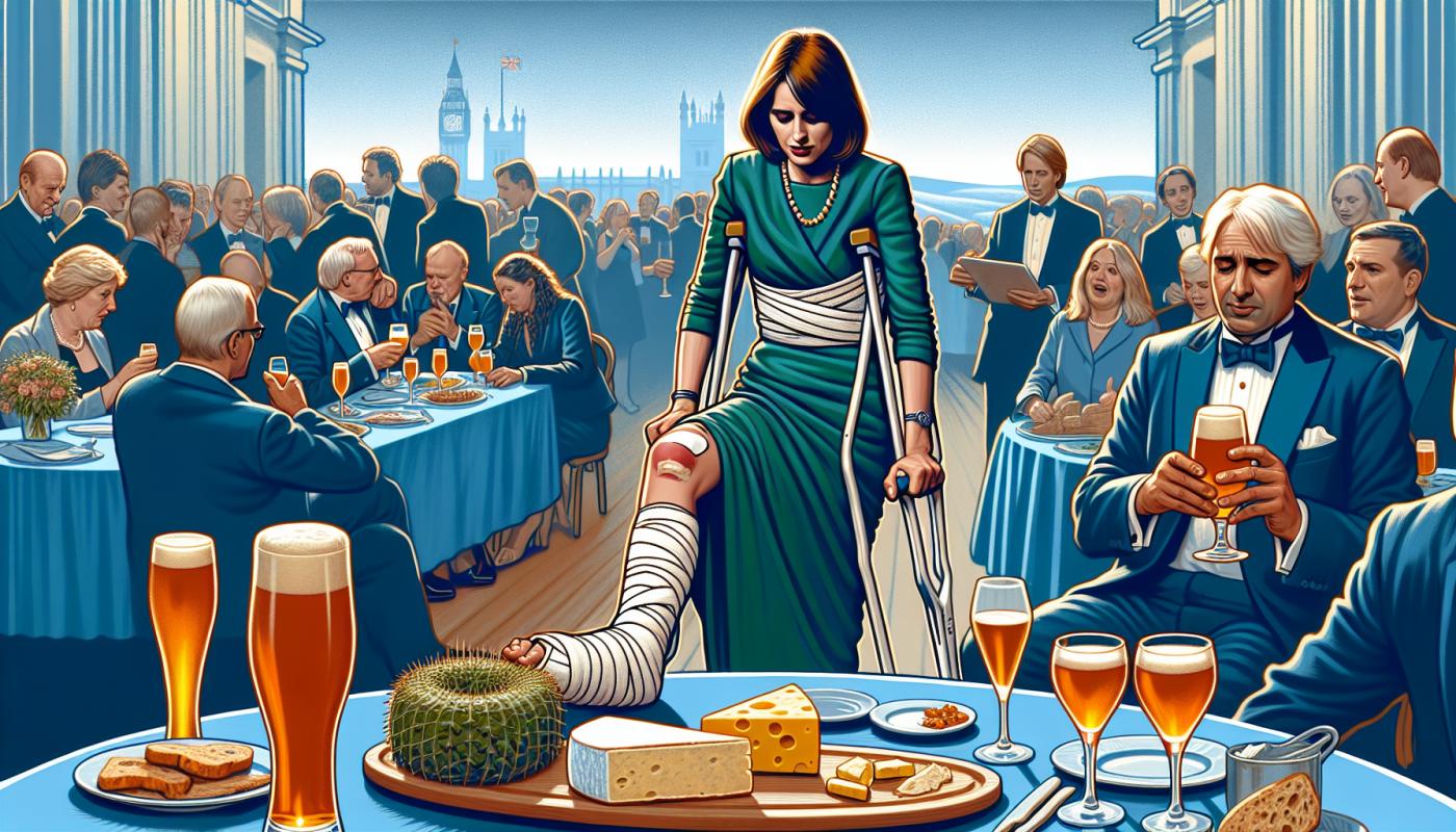 The injury occurred when she tripped in her heels. Despite the mishap, the royal visit continued with King Charles III sampling a craft beer named in his honor and the Queen receiving vintage cheddar for her birthday. Additionally, the couple was serenaded by local schoolchildren.