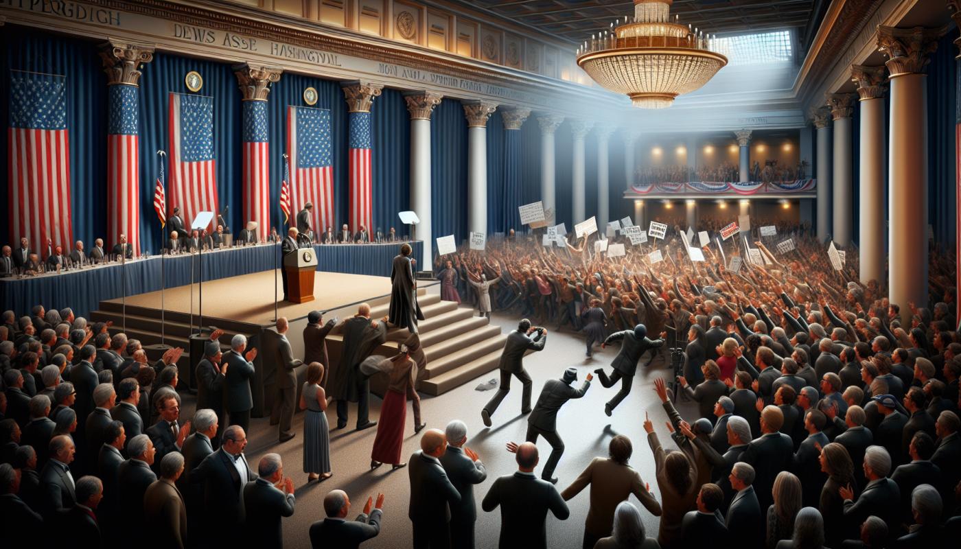 The demonstrators stormed the stage, shouting slogans before being escorted out, but Koch was unharmed and continued his speech. In his remarks, Koch criticized the current state of the country, referencing a departure from foundational principles and indirectly alluding to Donald Trump’s policies, particularly tariffs.